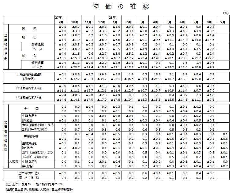 ●9月分の生鮮食品を除く総合の前年同月比は、東京都区部(速報)は▲0.5%で8月分の▲0.4%から下落率が拡大した。7カ月連続の下落だ。9月分の前月比は▲0.1%だった。大阪市の生鮮食品を除く総合の9月分前年同月比は▲0.7%と8月分の▲0.6%から下落率が拡大した。9月分の前月比は0.0%だった。