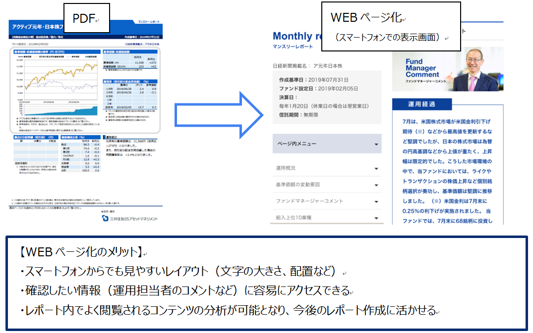 この月次レポートは、今般、パソコンだけでなくスマートフォンで閲覧するニーズが高まりつつあります。そこで当社は、お客さまの利便性を考慮し、当社直販「三井住友DS投信直販ネット」専用で販売している投資信託「アクティブ元年・日本株ファンド」の月次レポートをPDFではなくHTML化し、WEBページとして公開しました。今後も「アクティブ元年・日本株ファンド」の月次レポートは、WEBページ化しての公開を続ける予定です。また、他の投資信託の月次レポートや資料などのWEBページ化についても、検討してまいります。